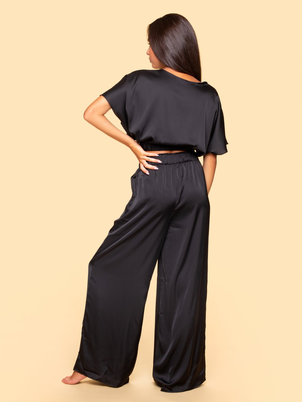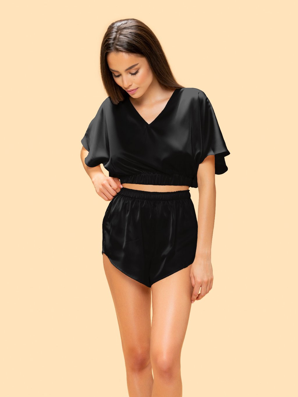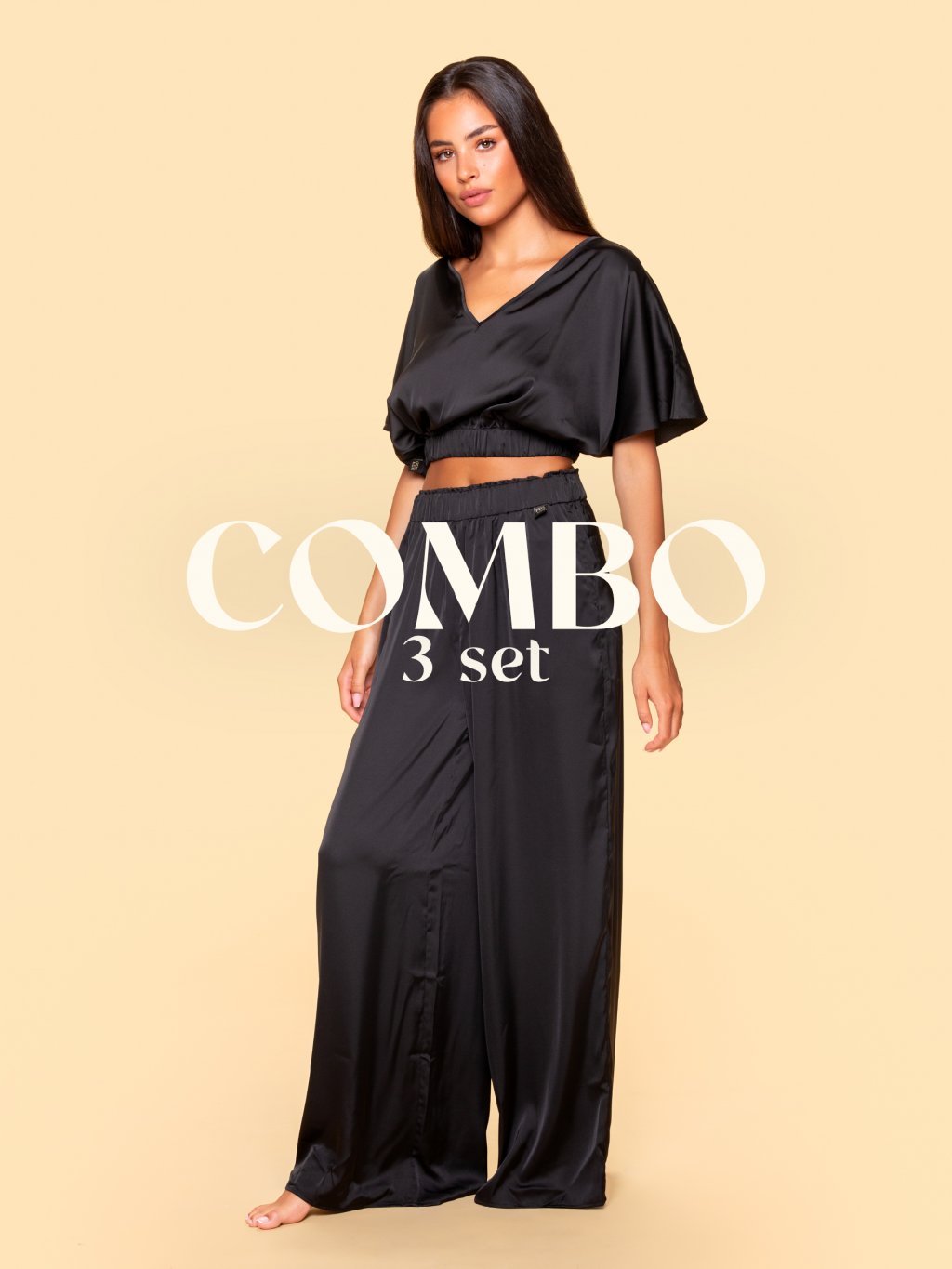 COMBO - Dámsky saténový set FANCY V - V top + Pants + Shorts - čierna