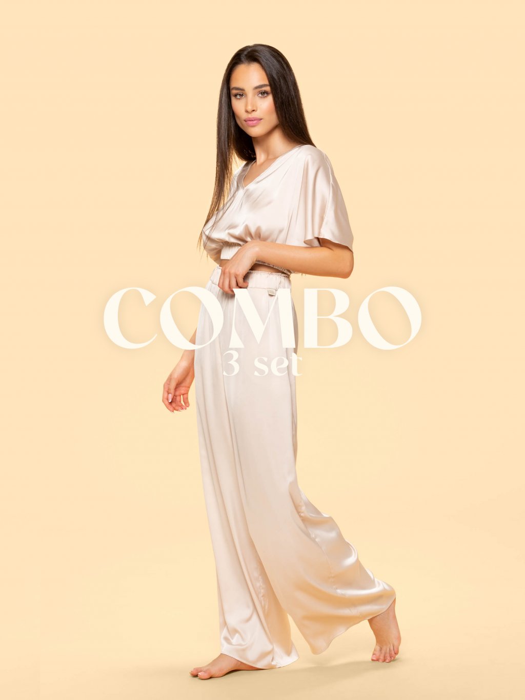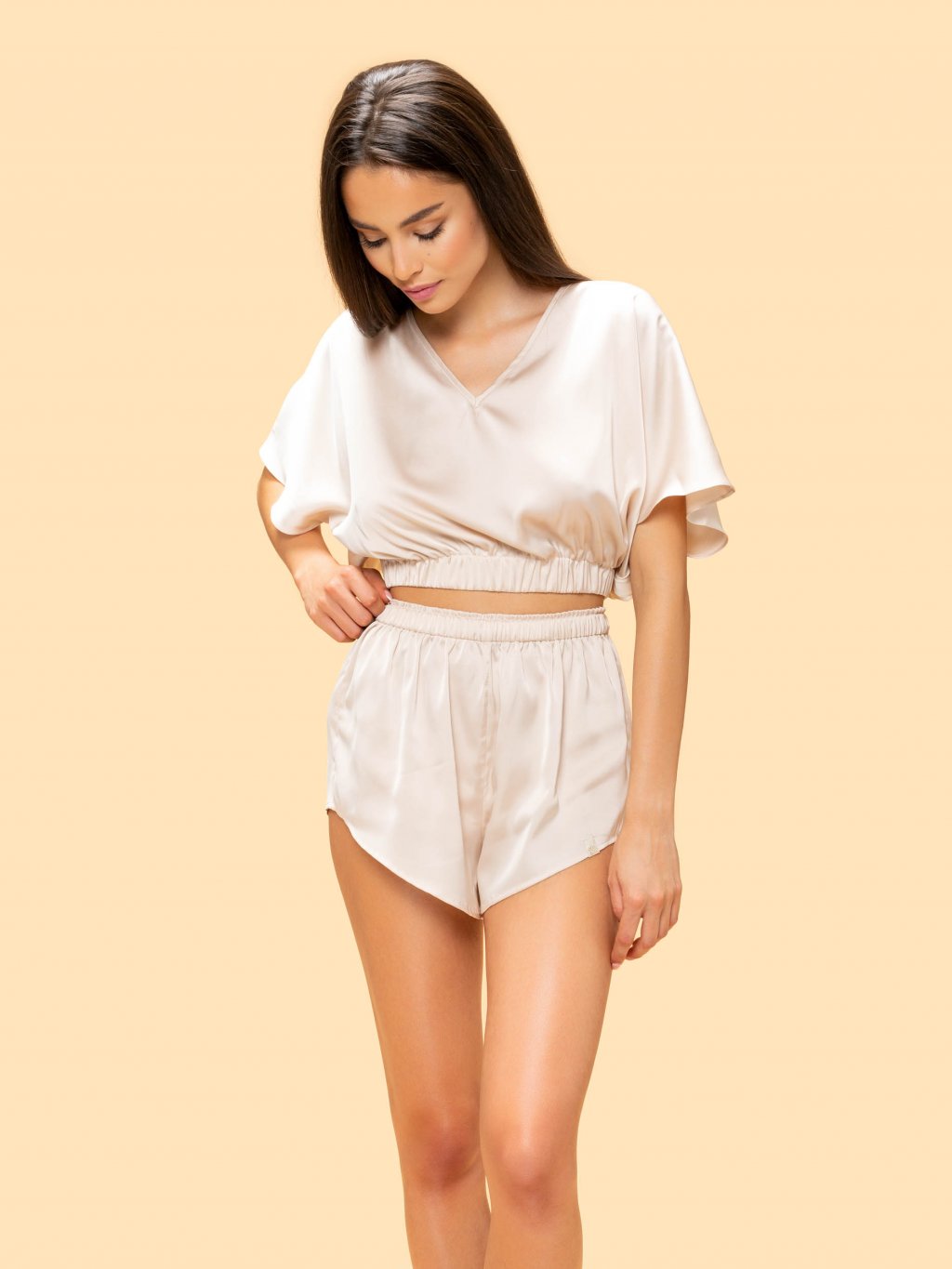 COMBO - Dámsky saténový set FANCY V - V top + Pants + Shorts - porcelán