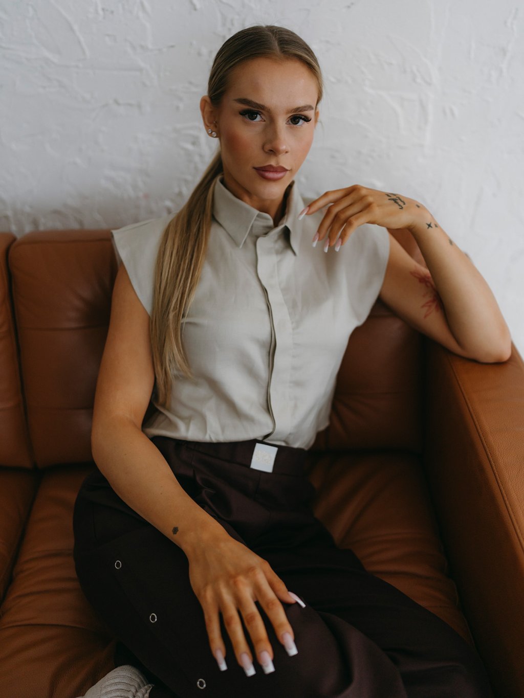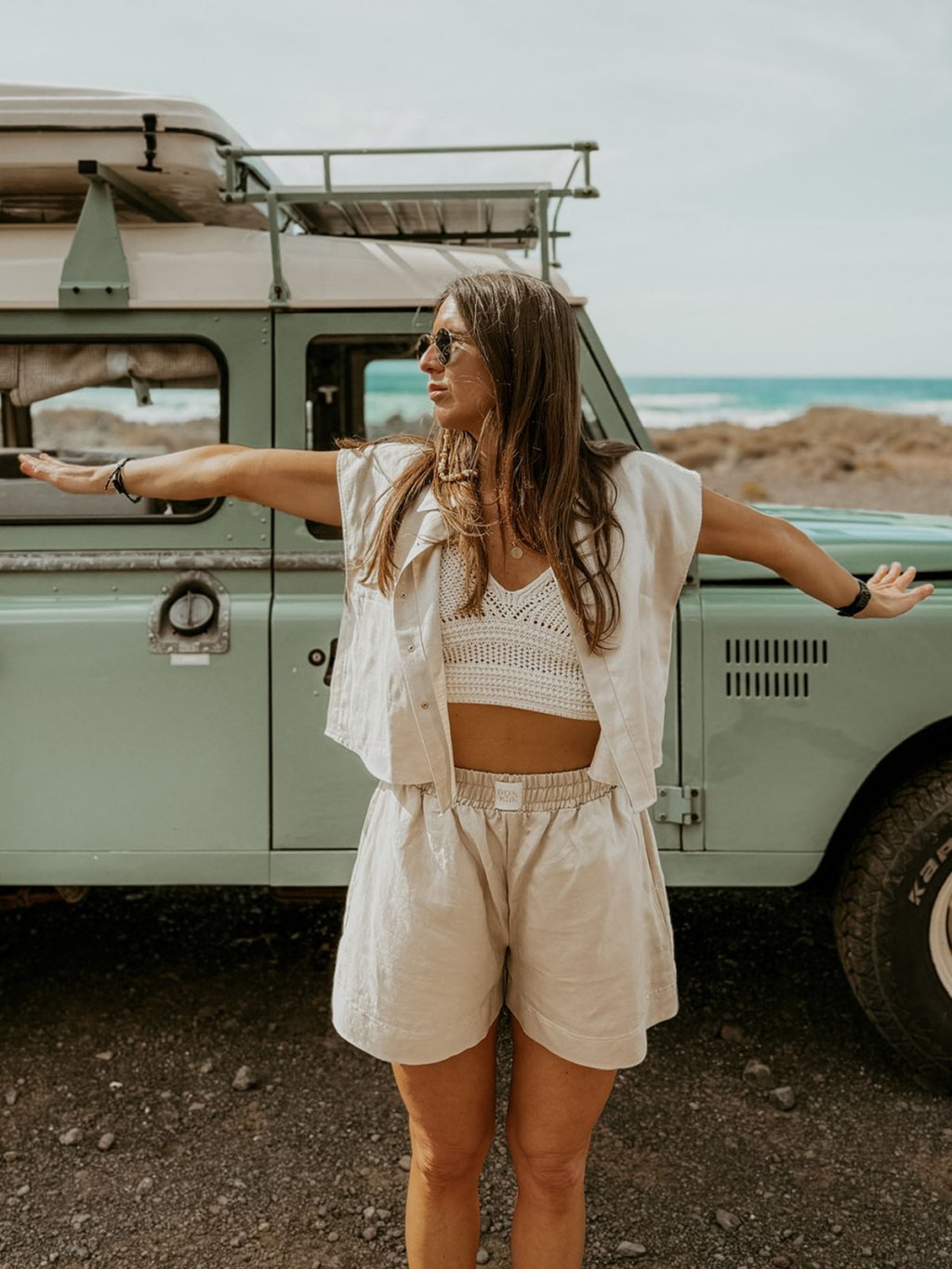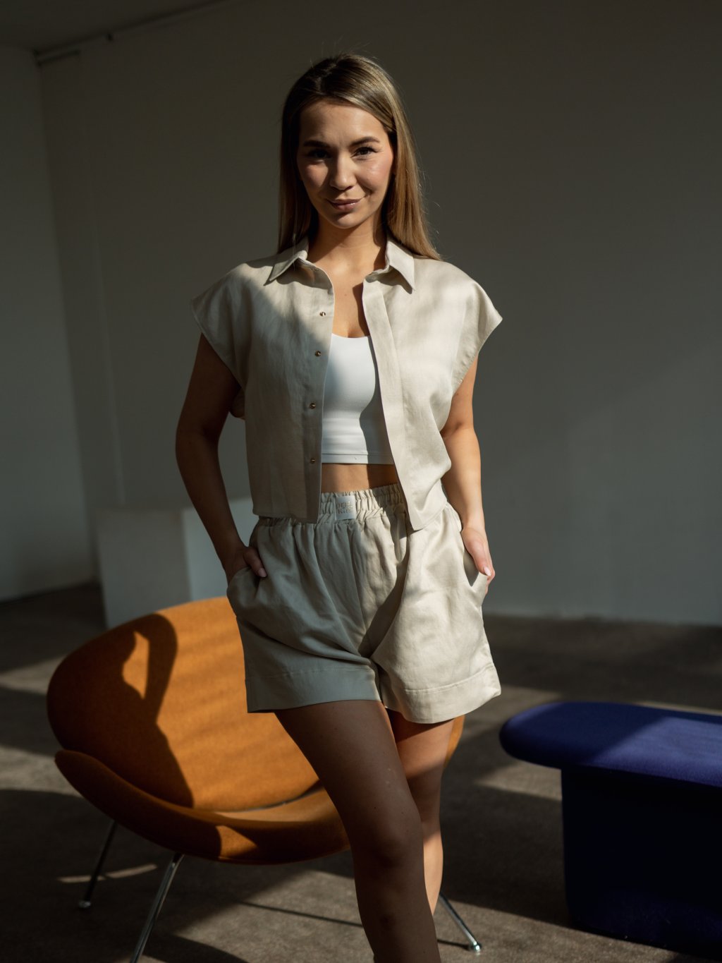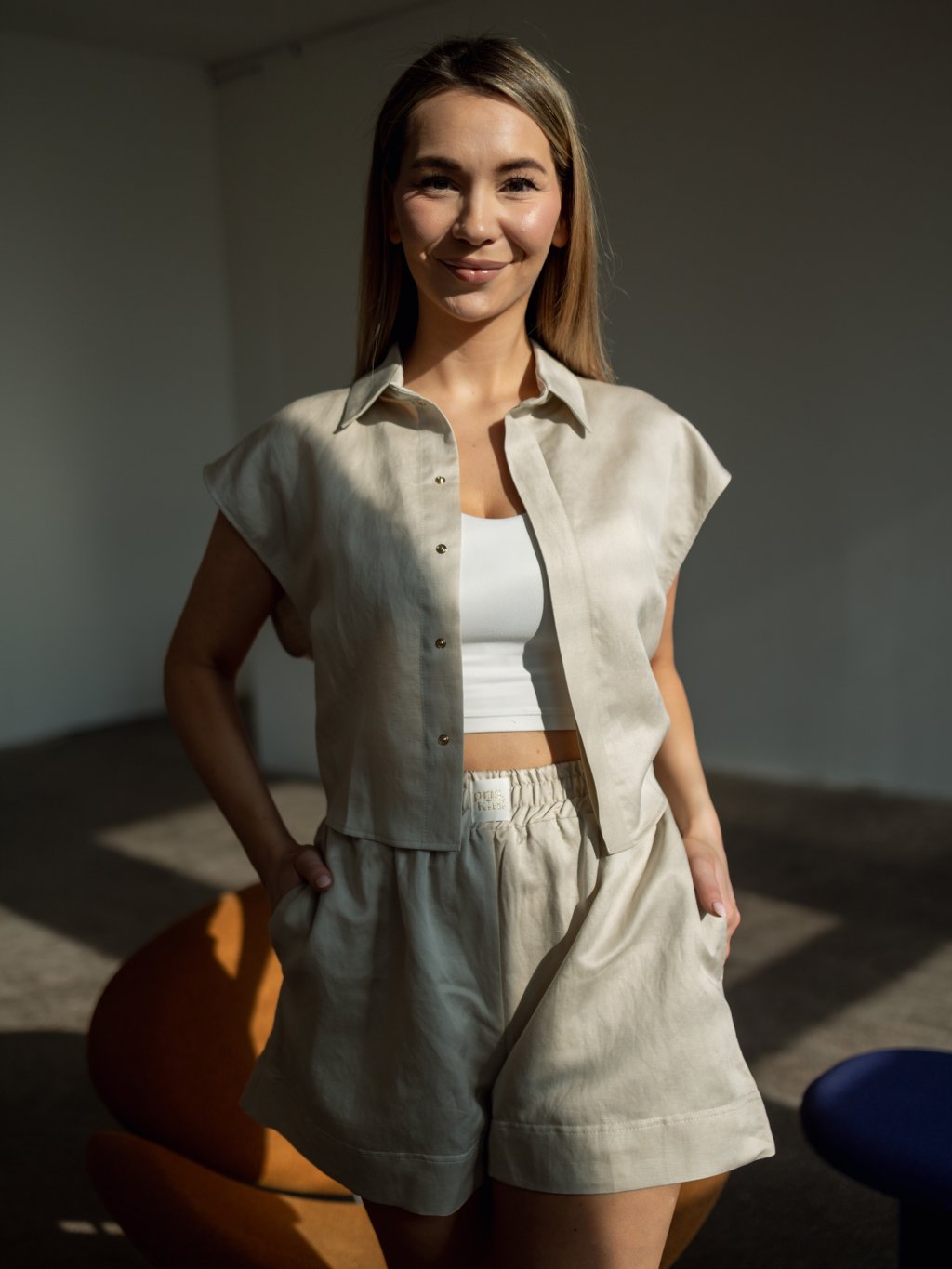 Dámska Crop kosela/vesta Priskini z kolekcie Tencel - Linen (ľan) je dokonalý vzdušný kúsok na každodenné nosenie. Crop vesta je detailne prepracovaná a využiješ ju počas horúcich dní alebo ju pokojne obleč na iný kúsok aj počas chladného počasia a dolaď ňou svoj outfit.