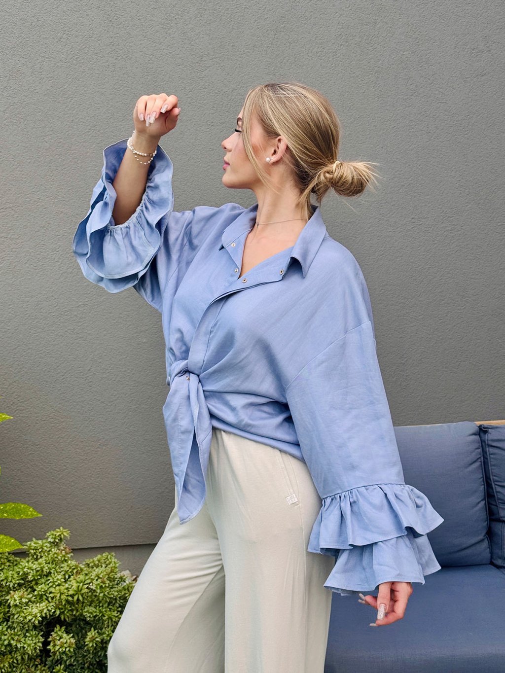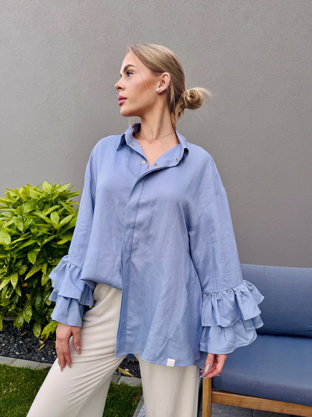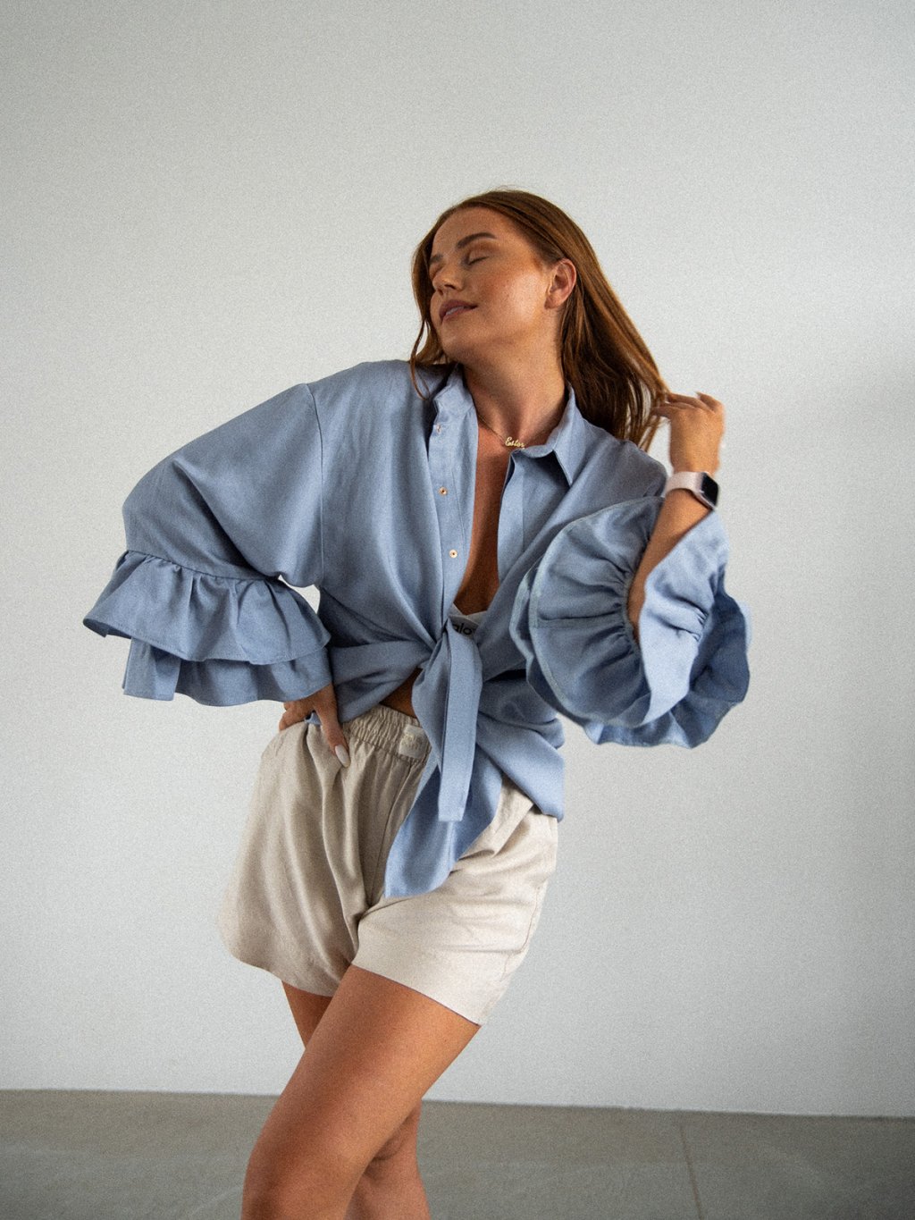 Dámska košeľa Priskini FLOWERs z kolekcie Tencel - Linen (ľan) je dokonalý vzdušný kúsok na každodenné nosenie. Prepracované detaily pôsobia luxusne, elegantne a volánové rukávy jej pridávajú romantický nádych. Košeľu si môžeš rozopnúť a zviazať na uzol. Vzadu je predĺžená pod zadok a pôsobí ako šaty.