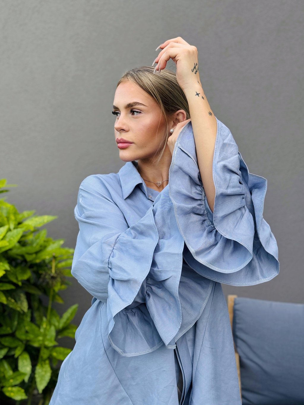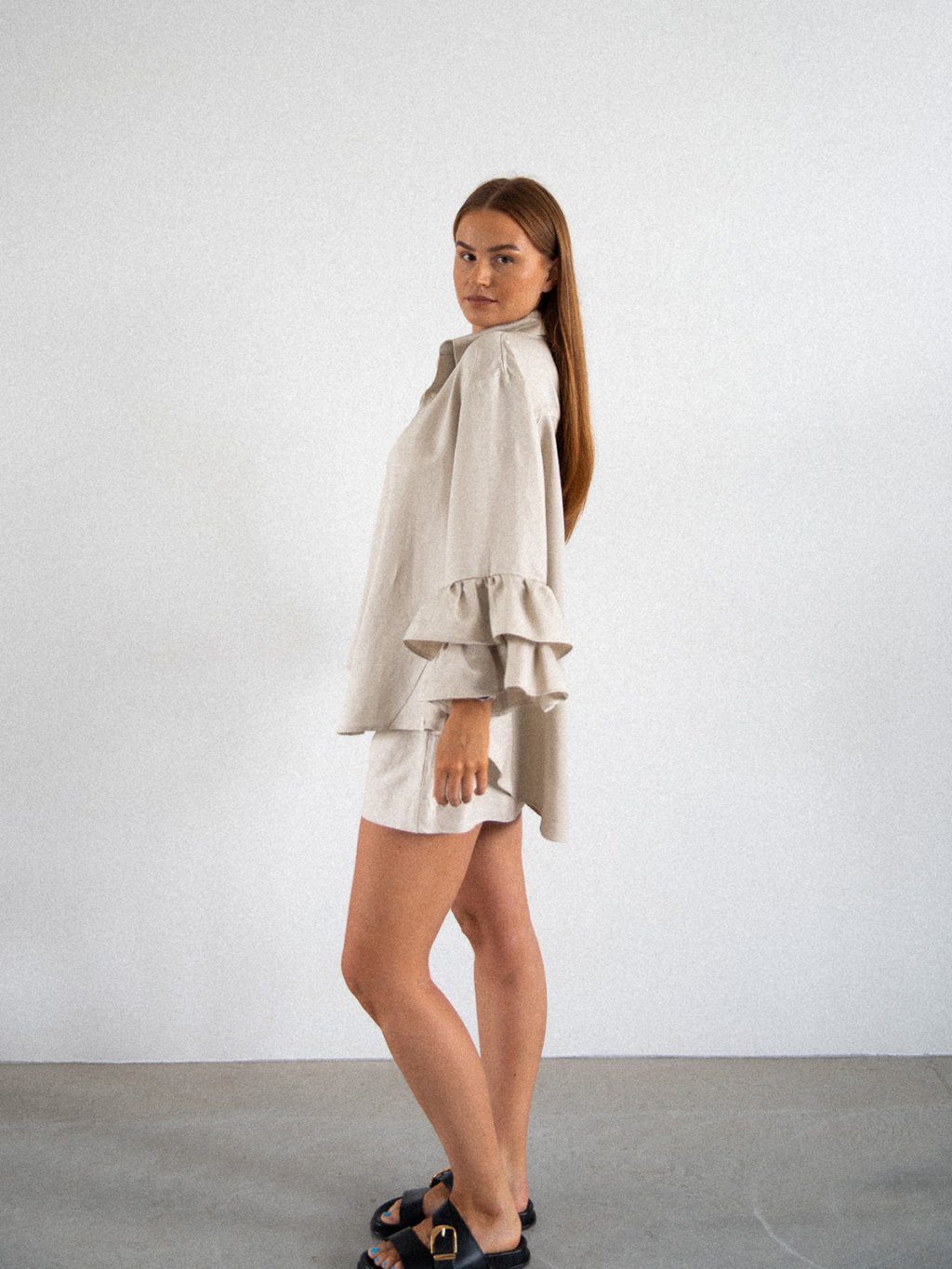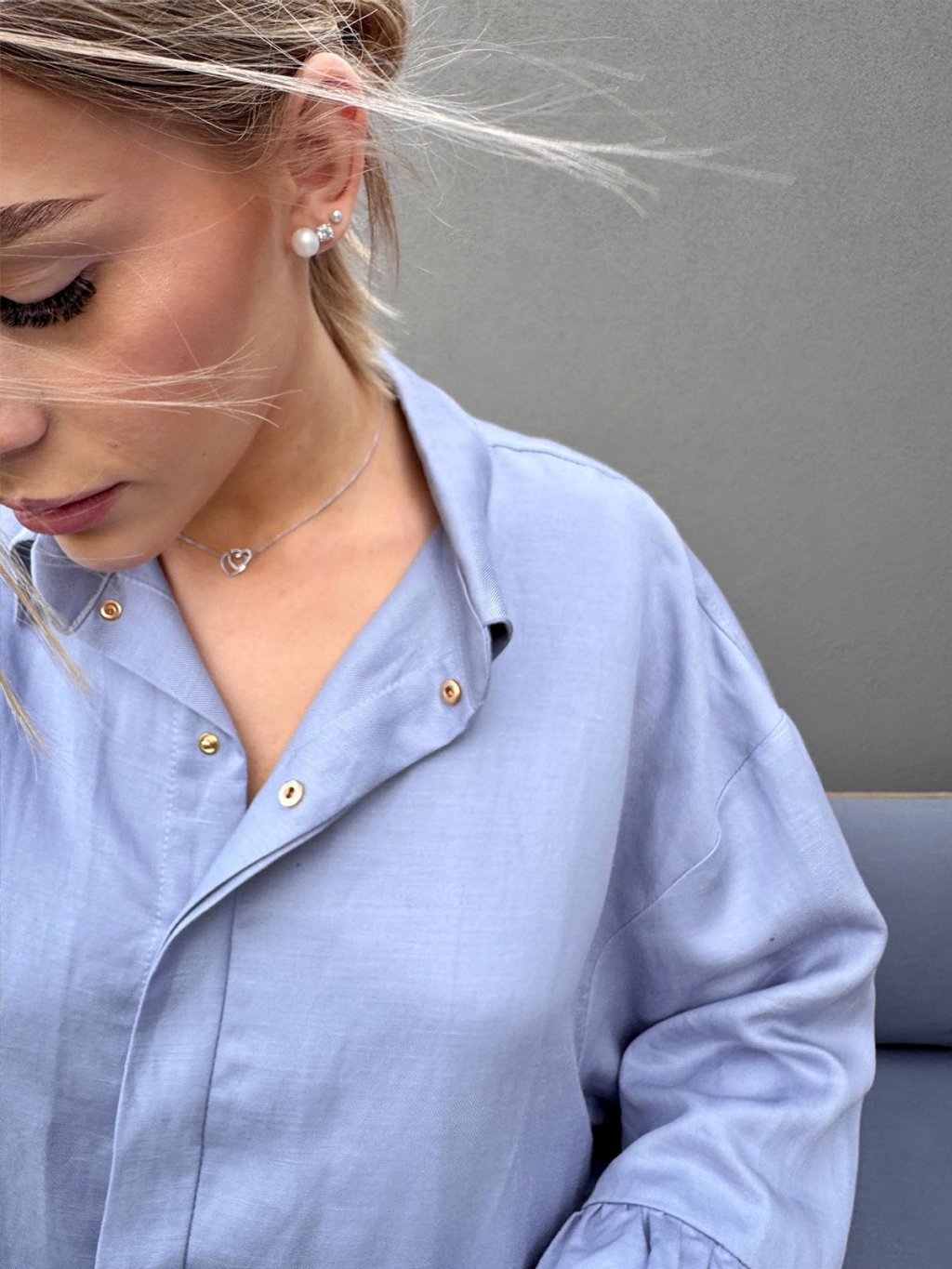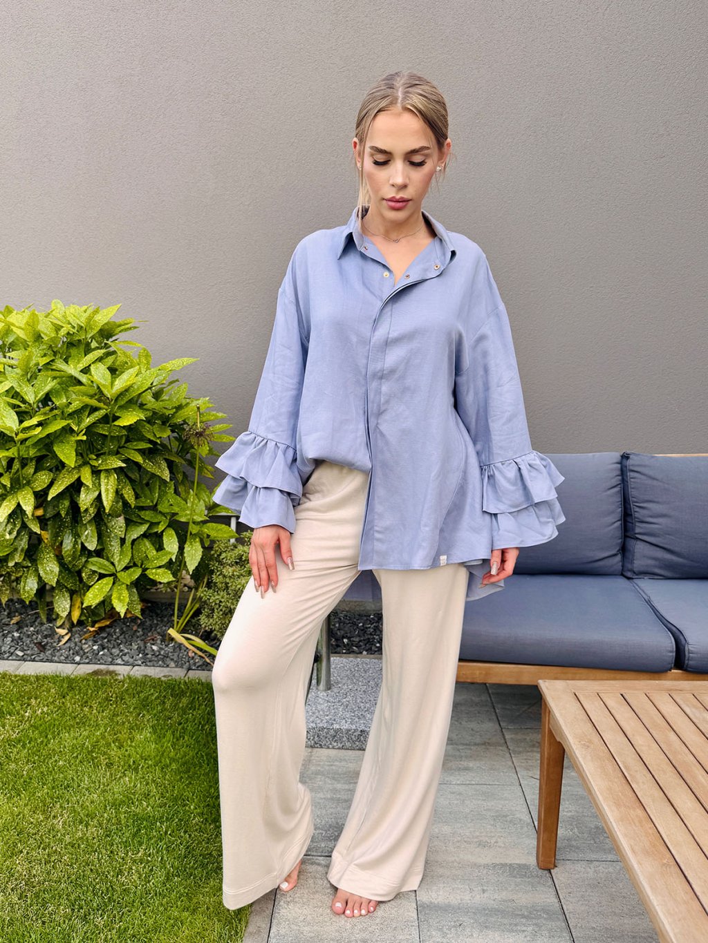 Dámska košeľa Priskini FLOWERs z kolekcie Tencel - Linen (ľan) je dokonalý vzdušný kúsok na každodenné nosenie. Prepracované detaily pôsobia luxusne, elegantne a volánové rukávy jej pridávajú romantický nádych. Košeľu si môžeš rozopnúť a zviazať na uzol. Vzadu je predĺžená pod zadok a pôsobí ako šaty.