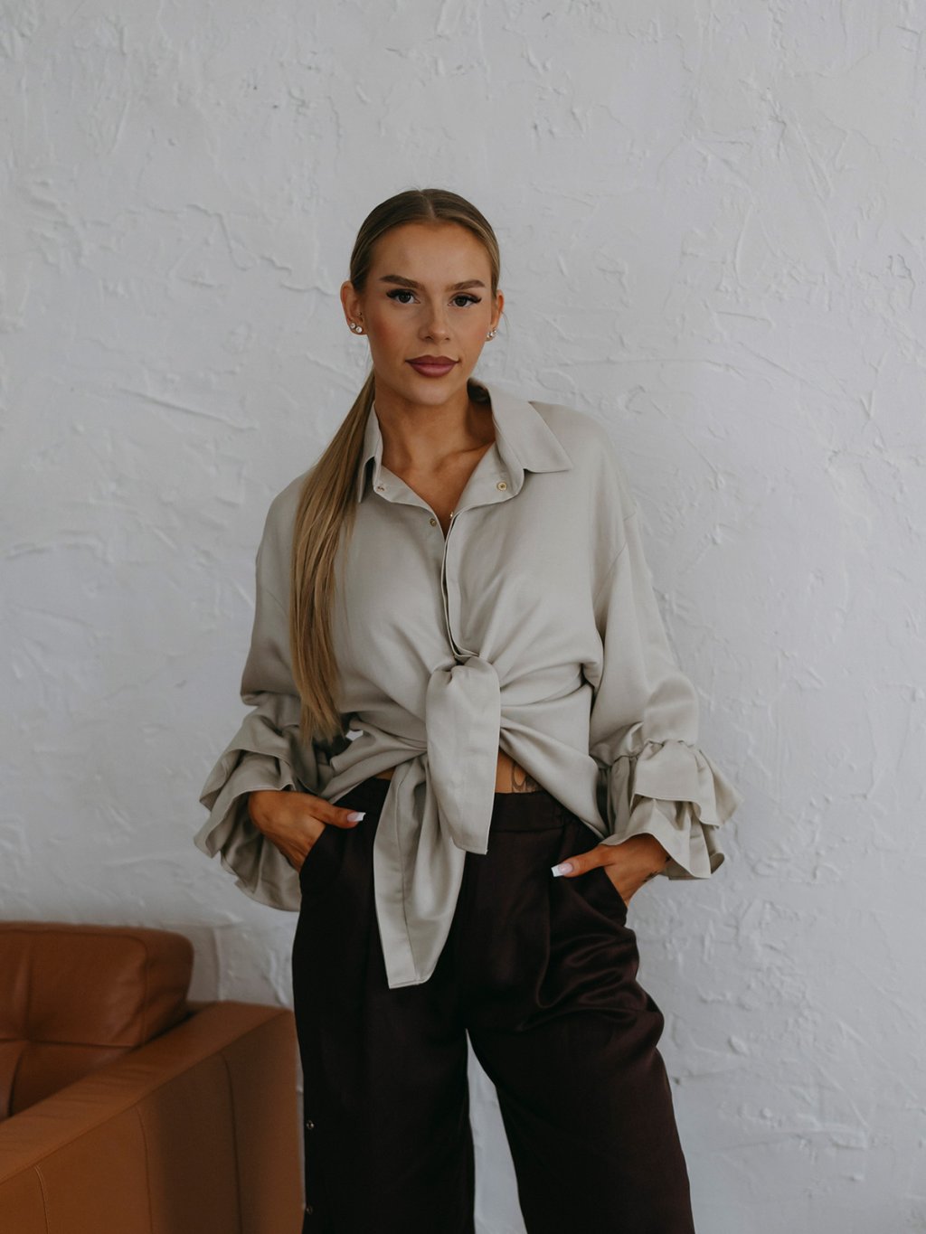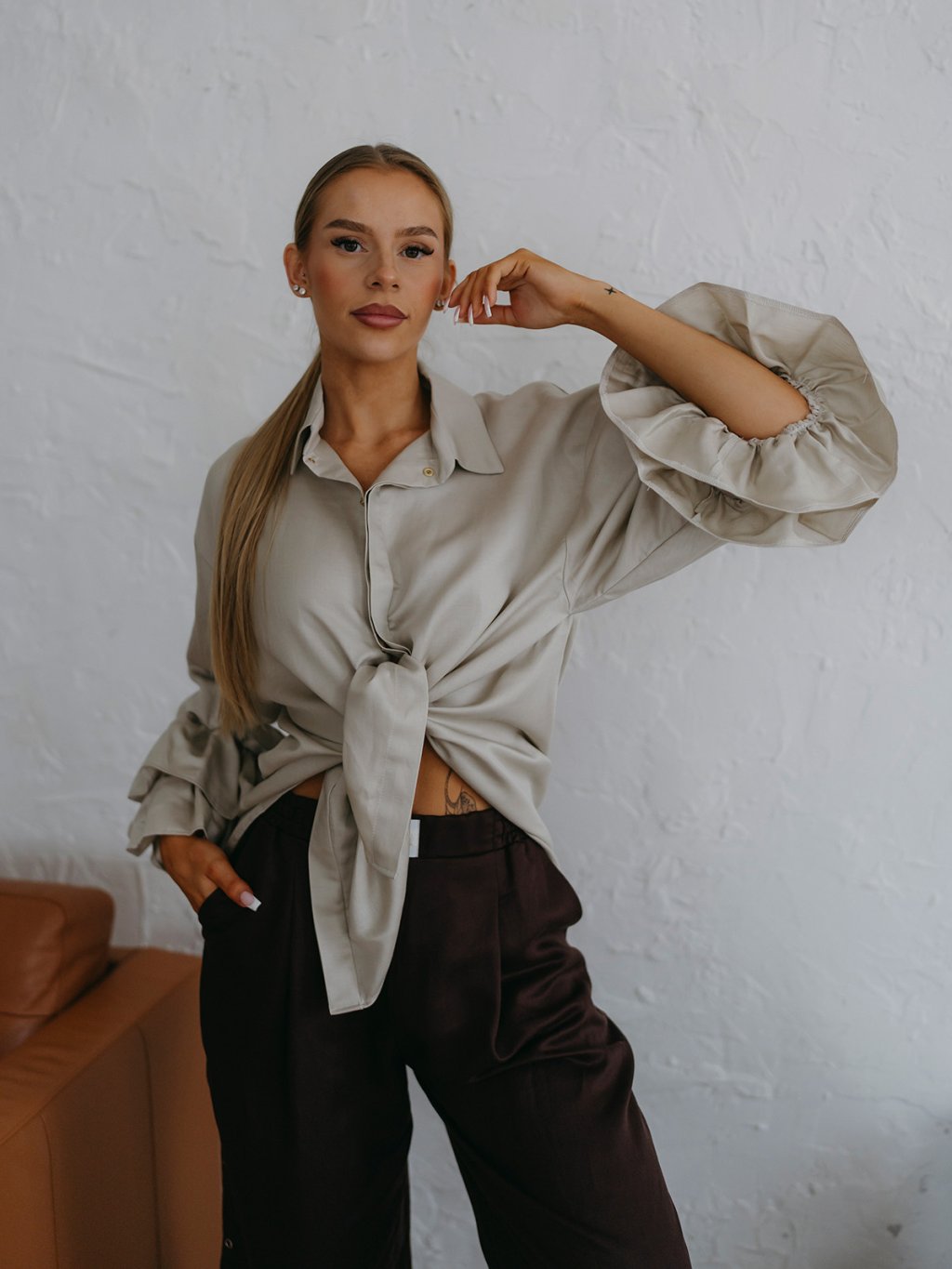 CHOCCO LIMITKA Štýlová dámska crop - kratšia košeľa RUBBY z materiálu Tencel - Ľan s dlhými rukávmi stiahnutými s gumičkou.
