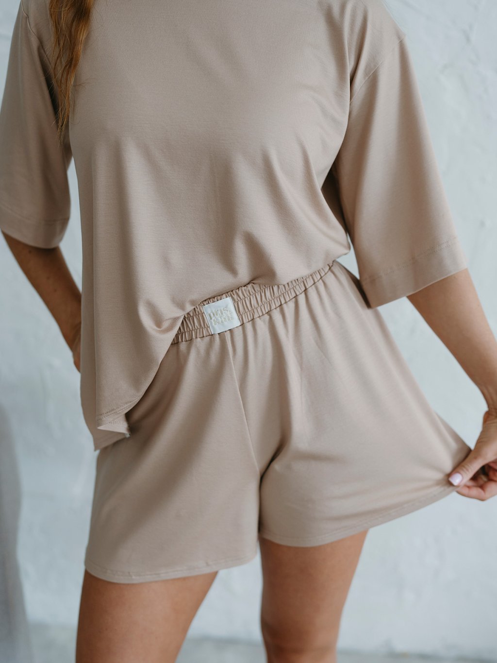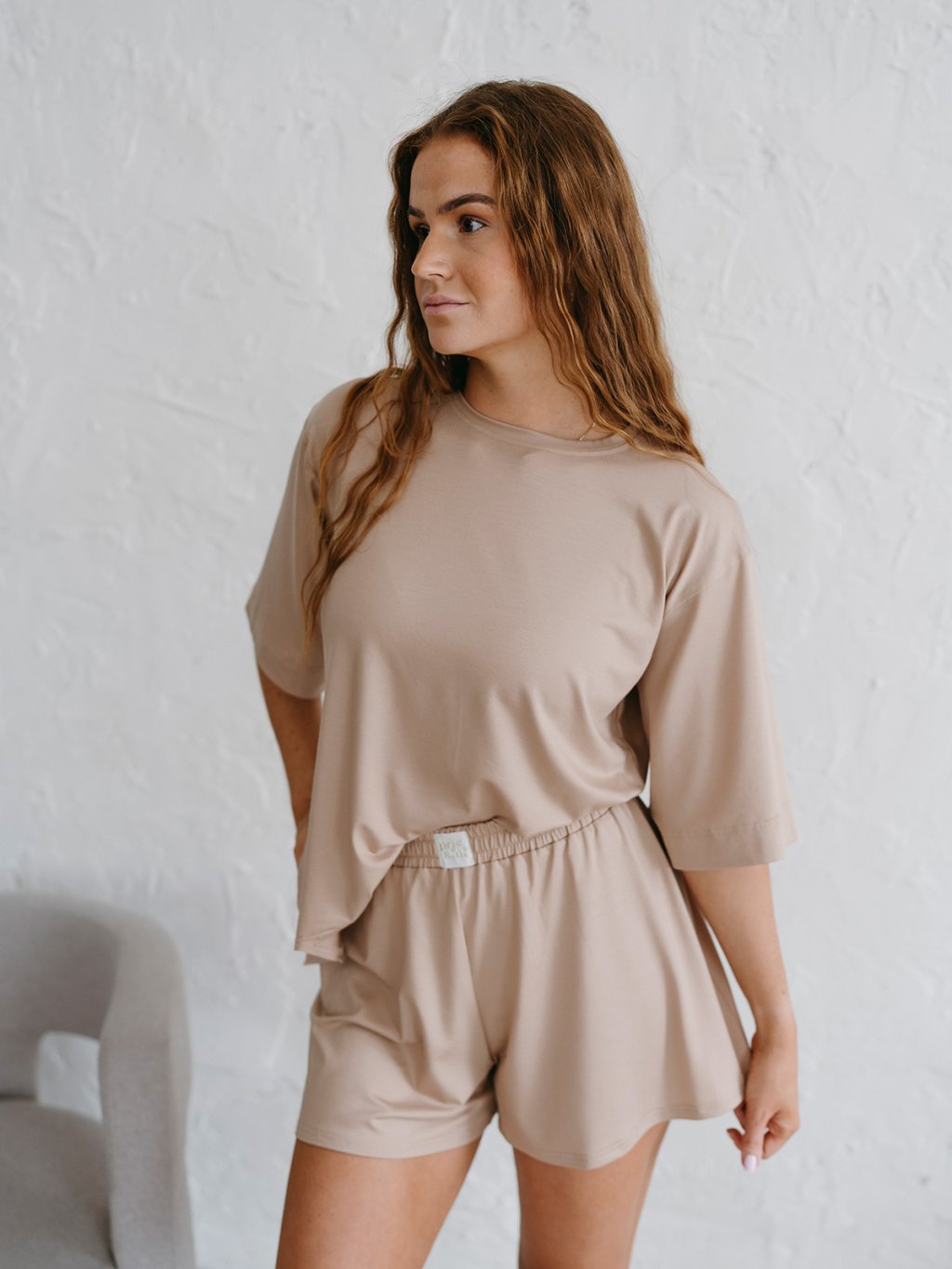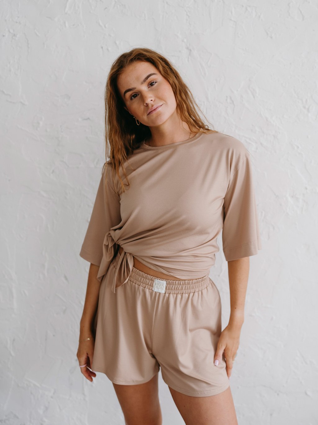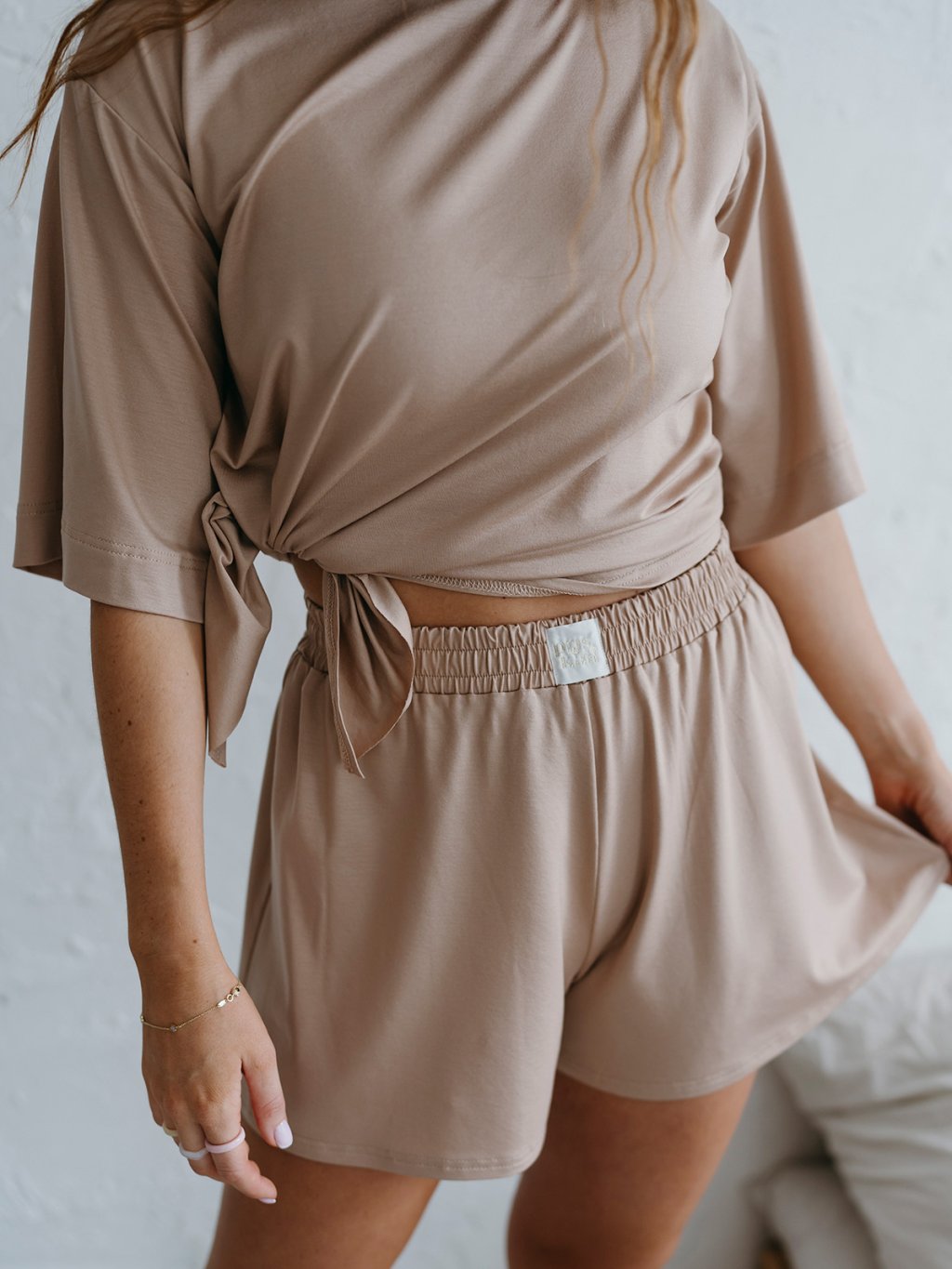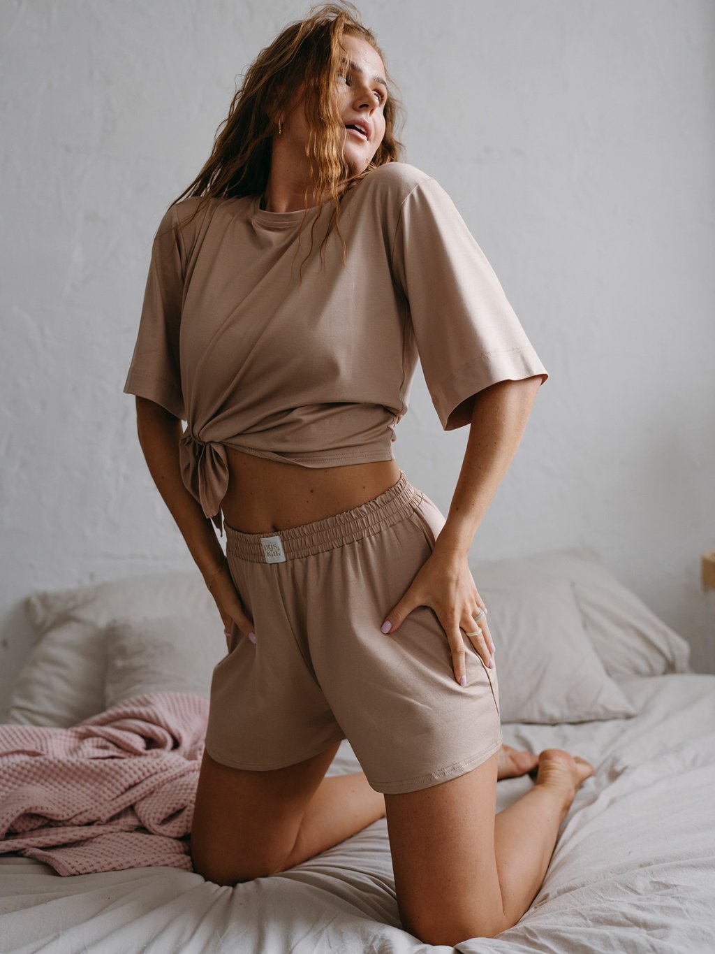 Priskini pyžamový set ELLE sa skladá z topu, ktorý môžes nosiť voľne padnutý alebo ho vďaka rozparku na dlhšej, šikmej strane uviazať na uzol a skrátiť podľa potreby. Alebo tričko / top zaprav na jednej strane, prípadne celé. Kreativita je už na tebe :)