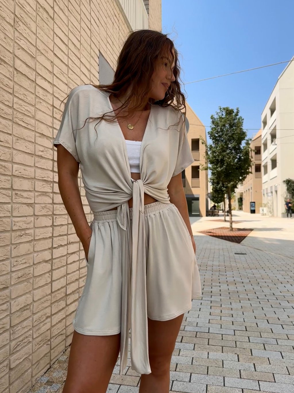 Hebký a ľahký otáčací a zaväzovací Fancy FLOWY top s krátkymi, padnutými rukávmi.