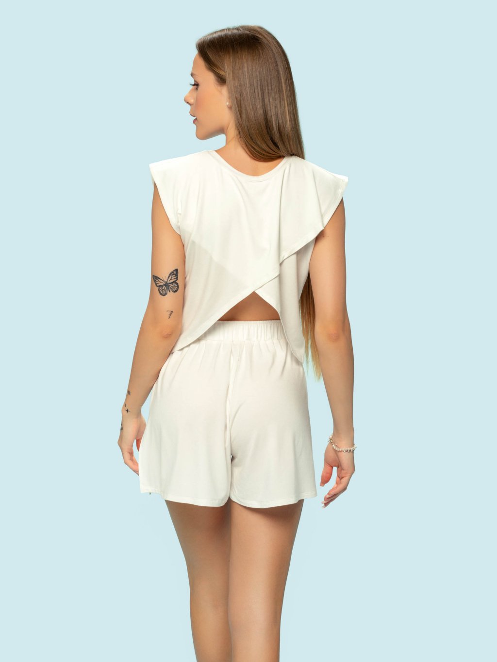 Priskini pyžamo FANCY TENCEL set obsahuje top, ktorý opäť môžeš nosiť obojstranne presne tak, ako sa ti to bude páčiť alebo akú budeš mať náladu. Ak chceš jemne poodhaliť bruško a byť sexi, obleč si preloženú stranu topu dopredu. Zadná časť ti naopak pekne zakryje celý chrbát. Ak nechceš byť vyzývavejšia, ale naopak zakryť svoje prsia a bruško, otoč top a jemne poodhalíš len chrbát.