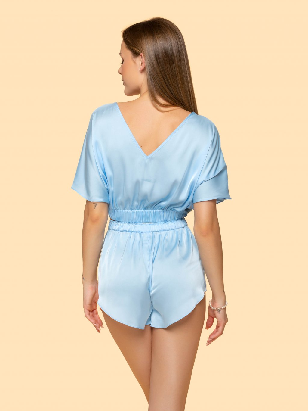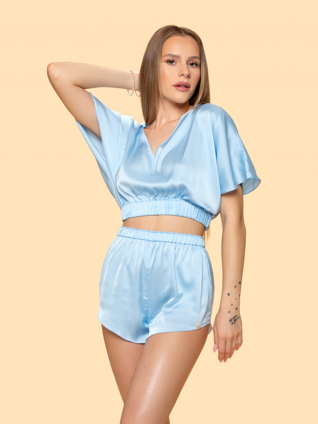 FANCY V set pozostáva z topu crop top strihu s voľnými padnutými rukávmi a výstrihom v tvare V. Je doplnený krátkymi vykrojenými kraťaskami.