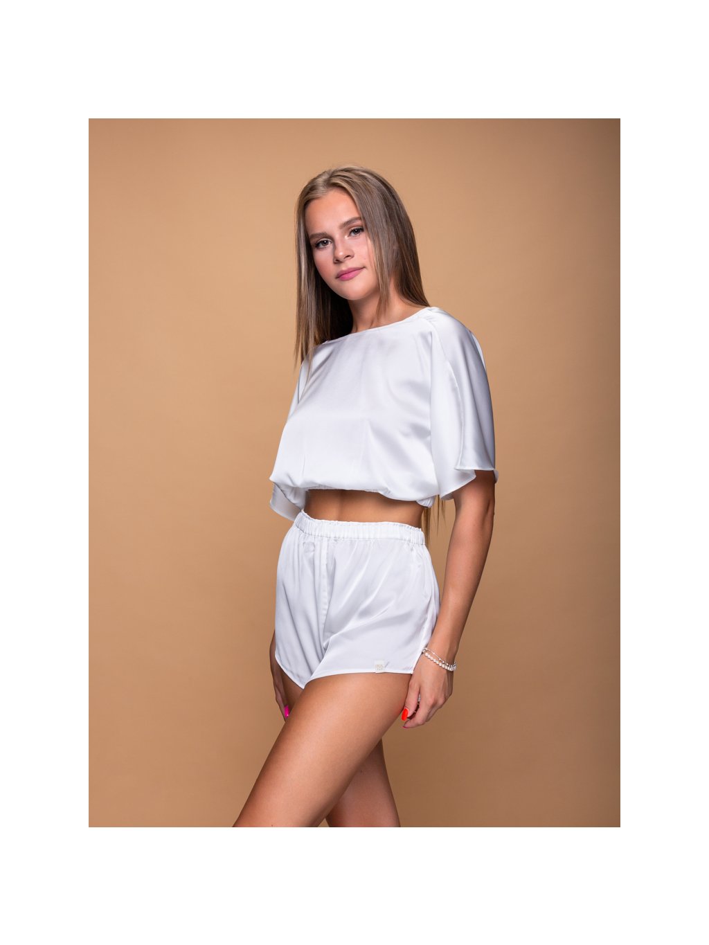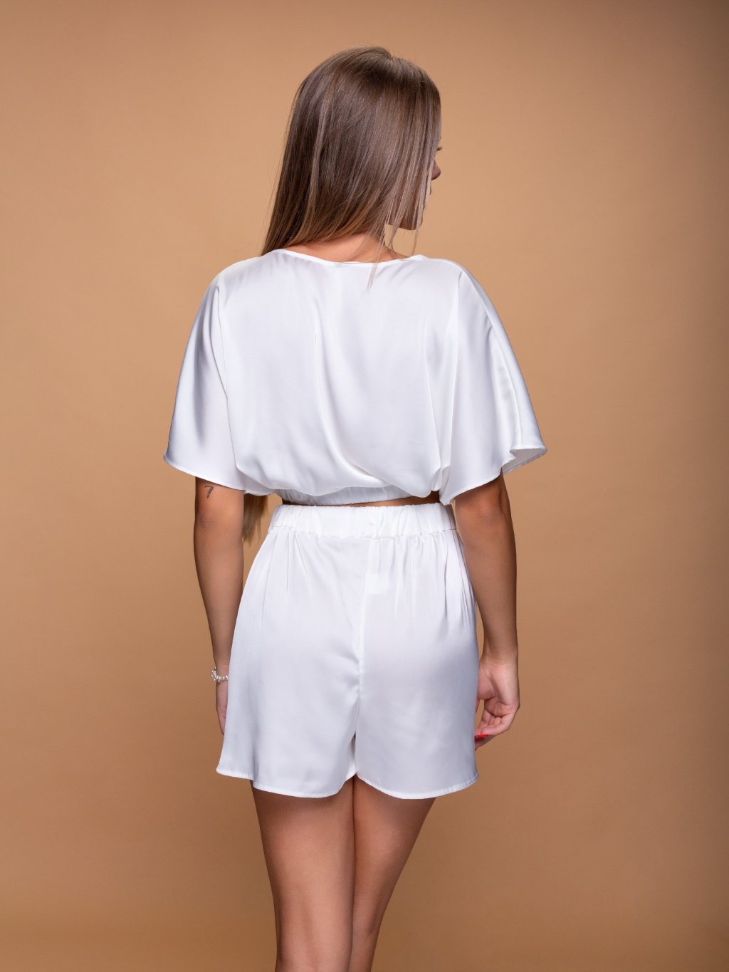 Dámske pyžamo Priskini - FANCY V set pozostáva z topu crop top strihu s voľnými padnutými rukávmi a výstrihom v tvare V. Je doplnený krátkymi vykrojenými kraťaskami.