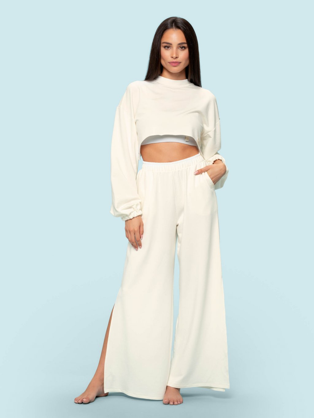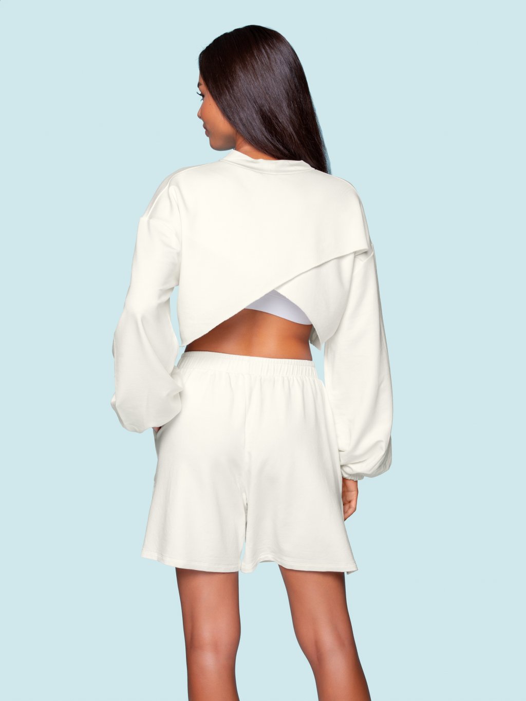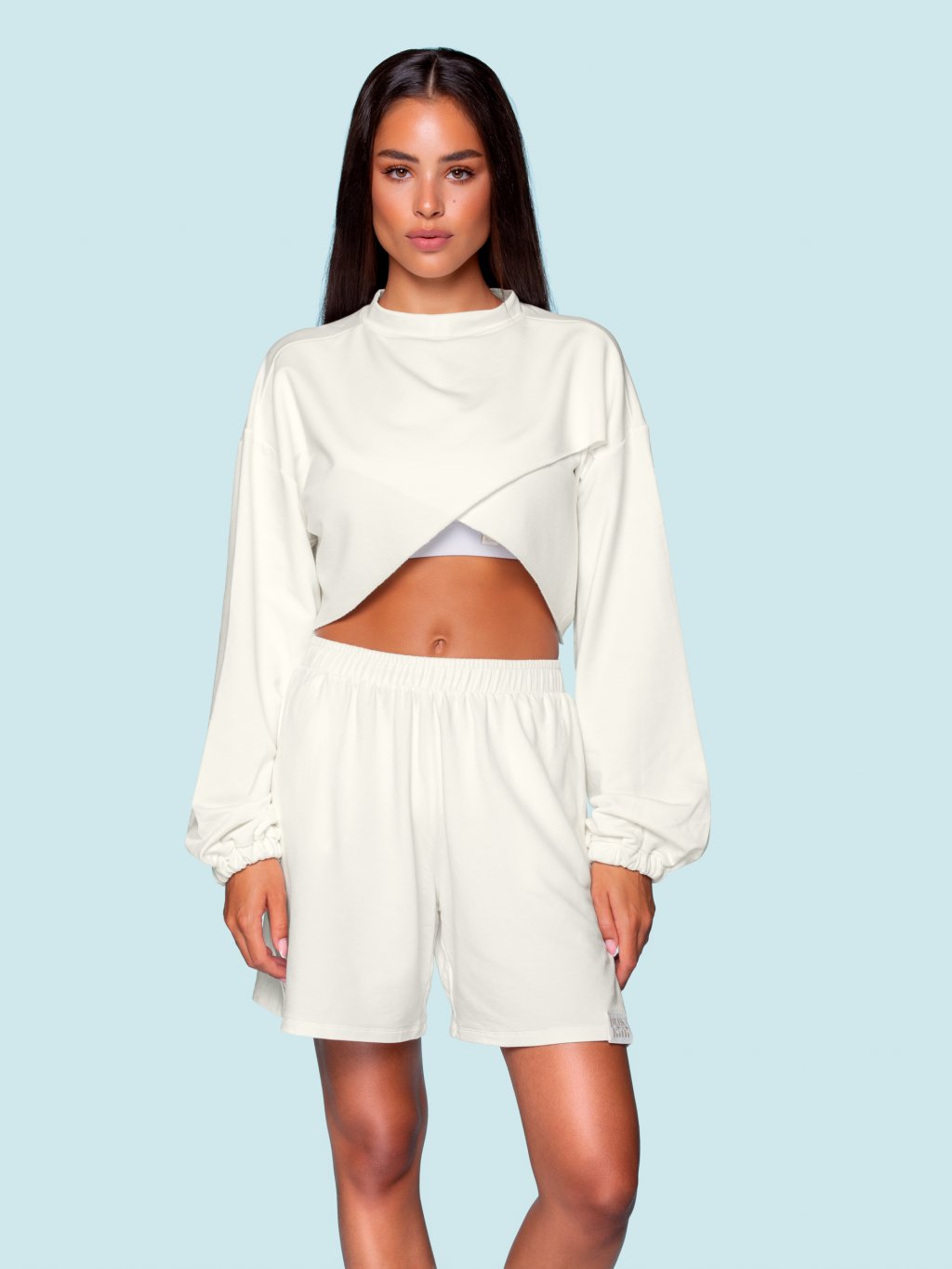 Priskini TENCEL DAY mikina je crop strihu s malým stojačikom a zvonovými rukávmi s gumičkou. Má voľný krátky strih a opäť ju môžeš obliecť podľa tvojej chuti - prekrížením vzadu alebo vpredu.