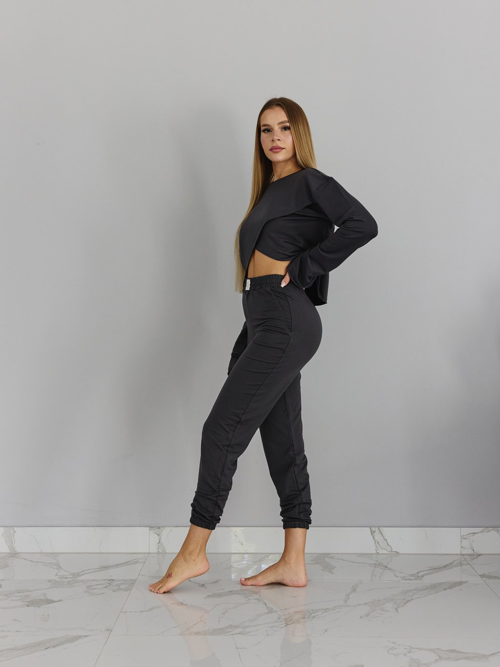 Tepláky nemajú vrecko a sú stiahnuté na členkoch gumičkou. Skombinuj ich s Twist topom pre dokonalú teplákovú súpravu :)